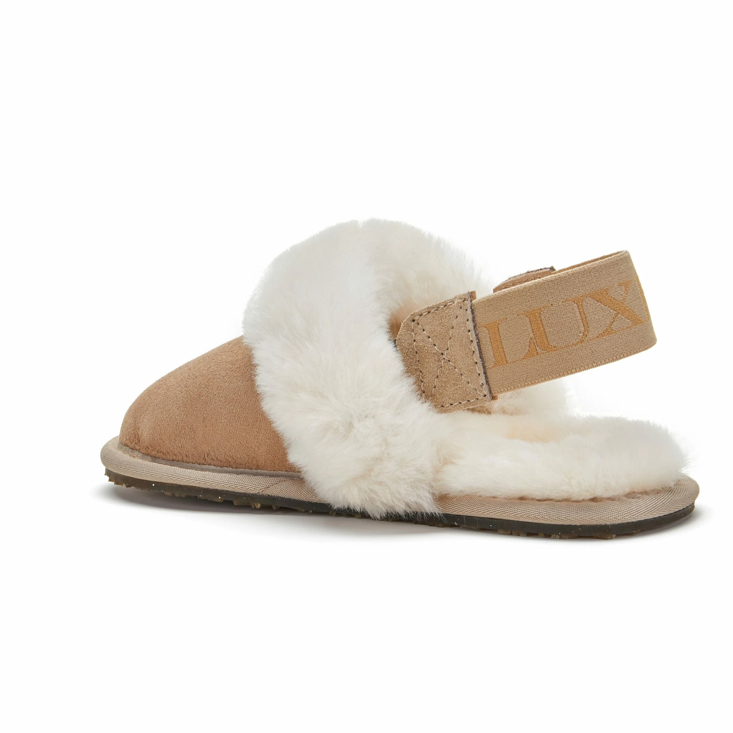 Luxe sheepskin mule slipper with removeable logo elastic heel strap